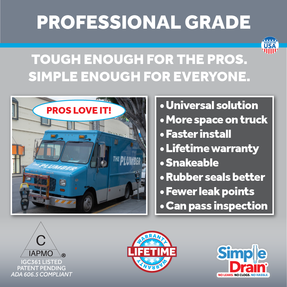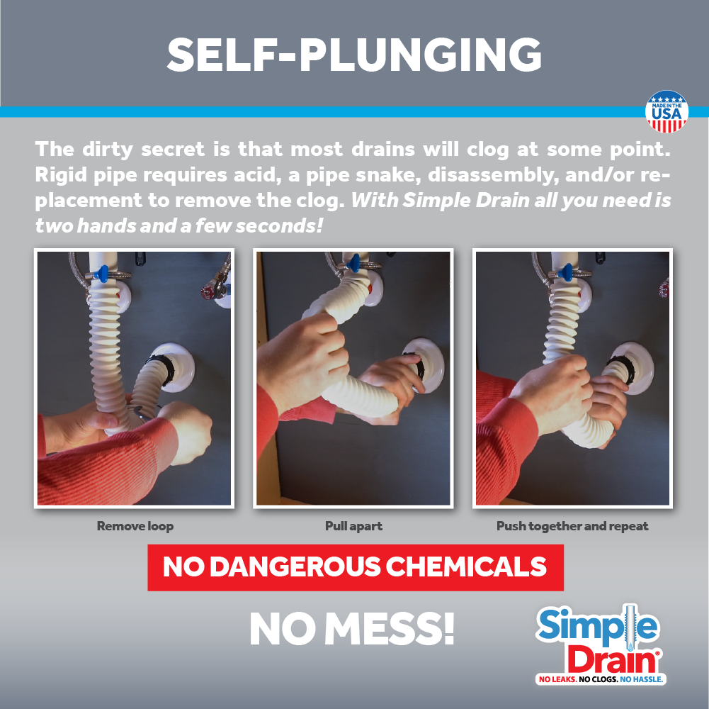 Introducing a new P-trap that is sure to be a “game changer”. With its patented flexible, durable rubber hose design, Simple Drain offers headache free installations for virtually every single and twin-bowl application. Pipe clean-out is a breeze, and clogs are a thing of the past thanks to the innovative “self- purging” feature. No plunger or chemicals required!